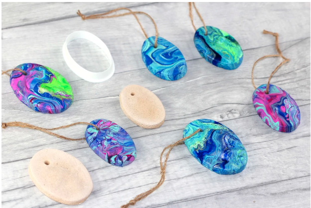 Pour over some acrylic paint, making sure to cover all the sides with colour, or paint normally. Leave to dry completely, then thread string through the hole at the top (if using) and secure with a knot before hanging.