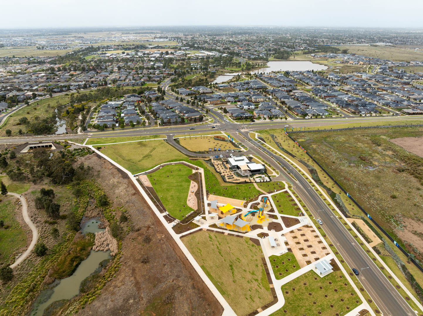 The Manor Lakes Boulevard Park is now open beside the Manor Lakes Sales Office. The park offers a large playground, sporting amenities, public toilets, shaded BBQ areas with family seating, and a purpose-built fenced dog park.