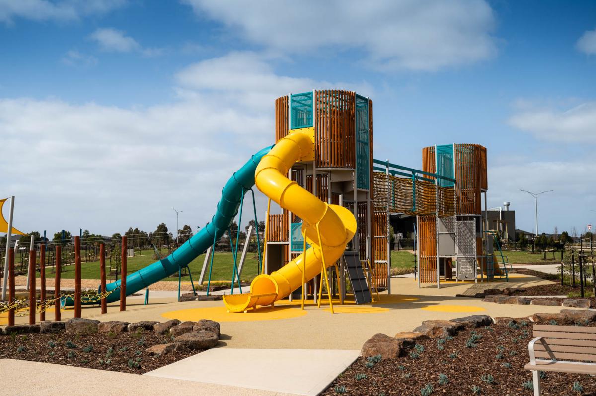 The recognisable double slide tower provides a wide view across the park, Manor Lakes and along Lollipop Creek.