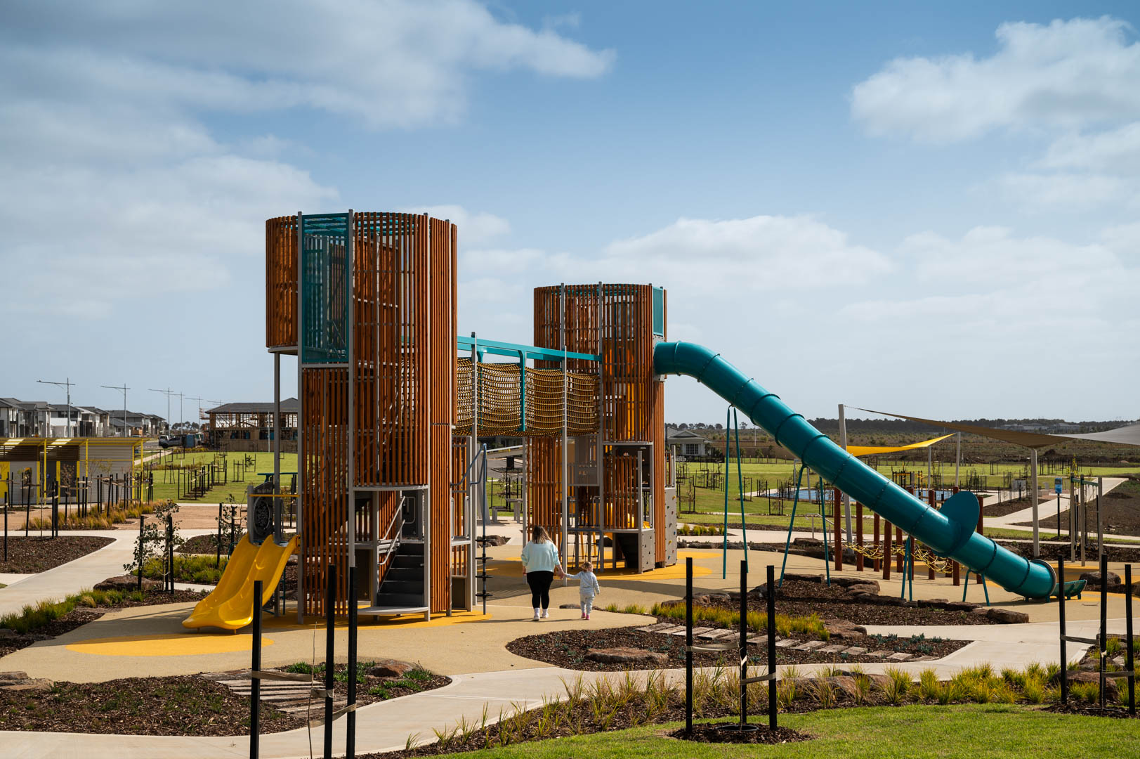 The recognisable double slide tower provides a wide view across the park, Manor Lakes and along Lollipop Creek.