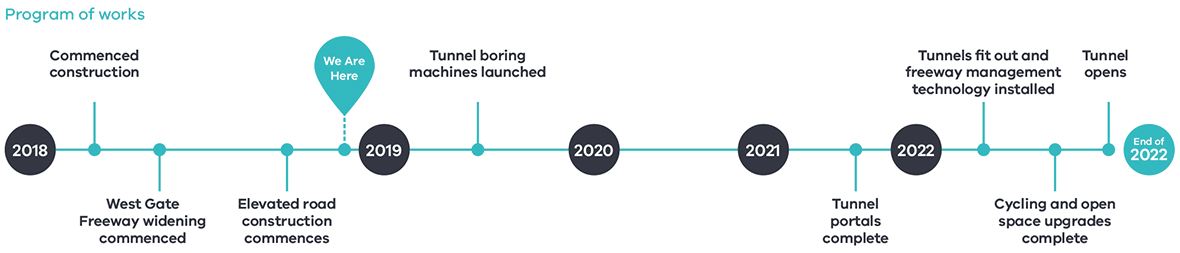There are three major construction precincts within the project, the West Gate Freeway, Tunnels and Port to City.