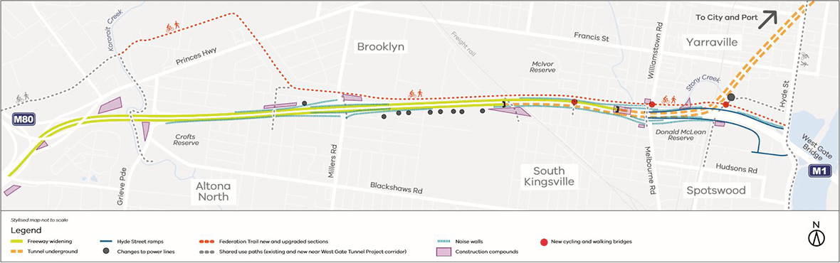 The West Gate Freeway widening project will see extra lanes on the freeway between the M80 Ring Road and Williamstown Road and entry and exit portals connecting the tunnels with the West Gate Freeway. Upgrades will also be undertaken on the M80 Ring Road, Millers